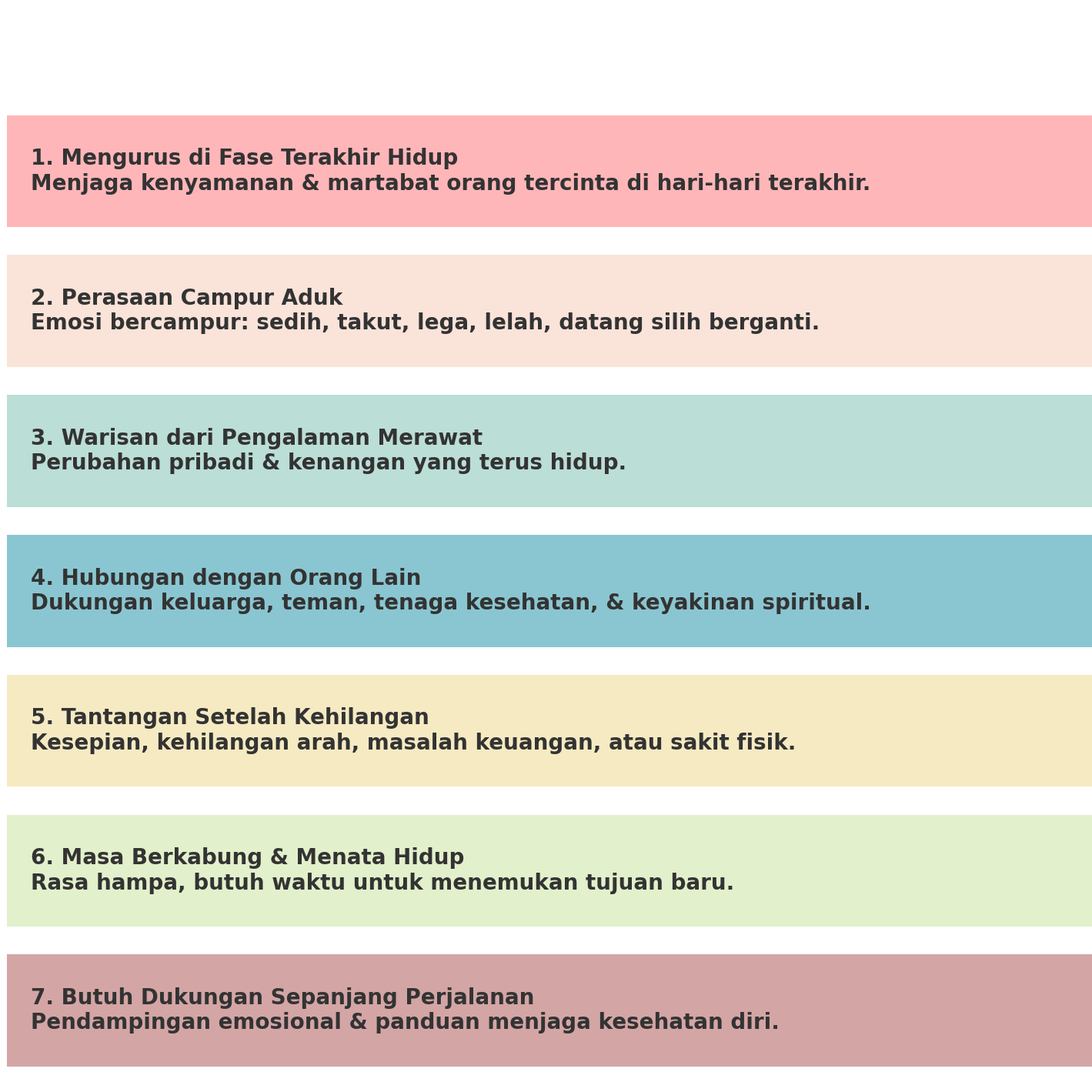Dengan pendekatan terintegrasi, yang melibatkan tenaga kesehatan, keluarga, dan komunitas, mantan caregiver dapat menemukan kembali keseimbangan hidup, membangun identitas baru, dan merawat diri mereka sendiri—sebagaimana dulu mereka merawat orang yang mereka cintai. Pada akhirnya, merawat orang yang merawat adalah bentuk kepedulian yang memastikan kemanusiaan hadir di setiap tahap kehidupan, termasuk setelah perpisahan.