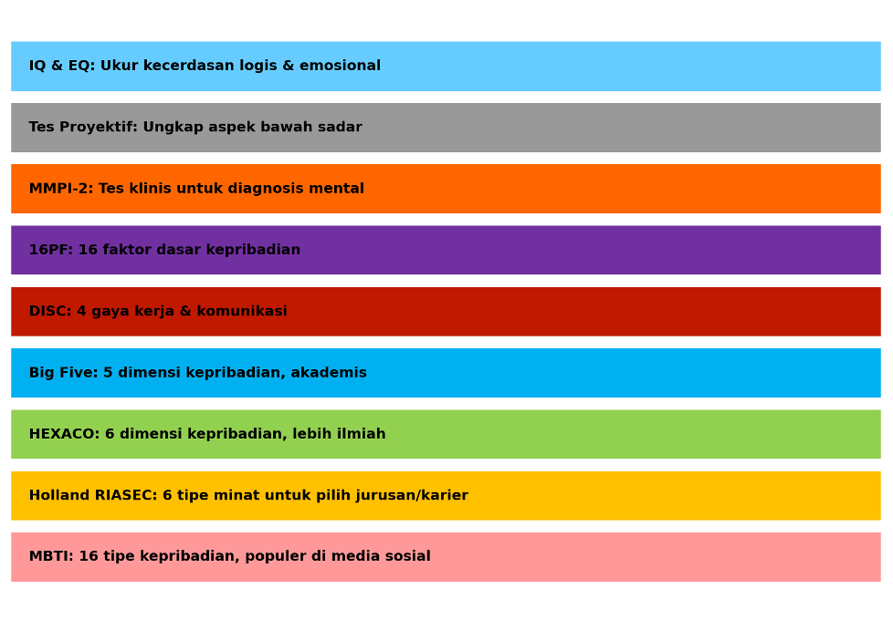 Buat kamu yang penasaran sama gaya kerja dan interaksi, ada juga DISC yang banyak dipakai di dunia profesional. Nggak cuma itu, kalau ingin lebih dalam lagi, ada tes seperti 16PF atau bahkan tes klinis seperti MMPI-2 dan tes proyektif yang biasa digunakan psikolog untuk asesmen mendalam. Masing-masing punya tujuan berbeda, tapi intinya sama: membantu kamu memahami siapa dirimu sebenarnya—baik untuk pengembangan diri, hubungan sosial, maupun pilihan karier. Sekarang ayo sedikit kita bahas mengenai beberapa jenis tes kepribadian di atas!